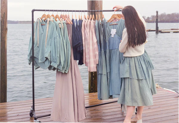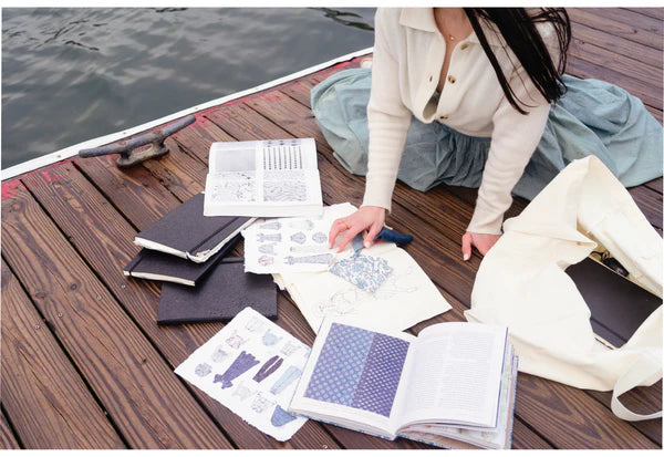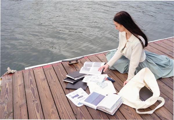 The dock is quiet, but the moment is alive. Pages ruffle in the breeze, fabric shifts with the wind, and the water gently presses against the wood. Sunlight spills across the planks, casting a soft glow over notebooks, swatches, and fragments of past collections. Photographs, faded at the edges, sit beside sketches drawn with intention. Each piece is a whisper from seasons past, asking to be remembered. Here, inspiration lingers softly, an echo of what was, shaping what’s to come.