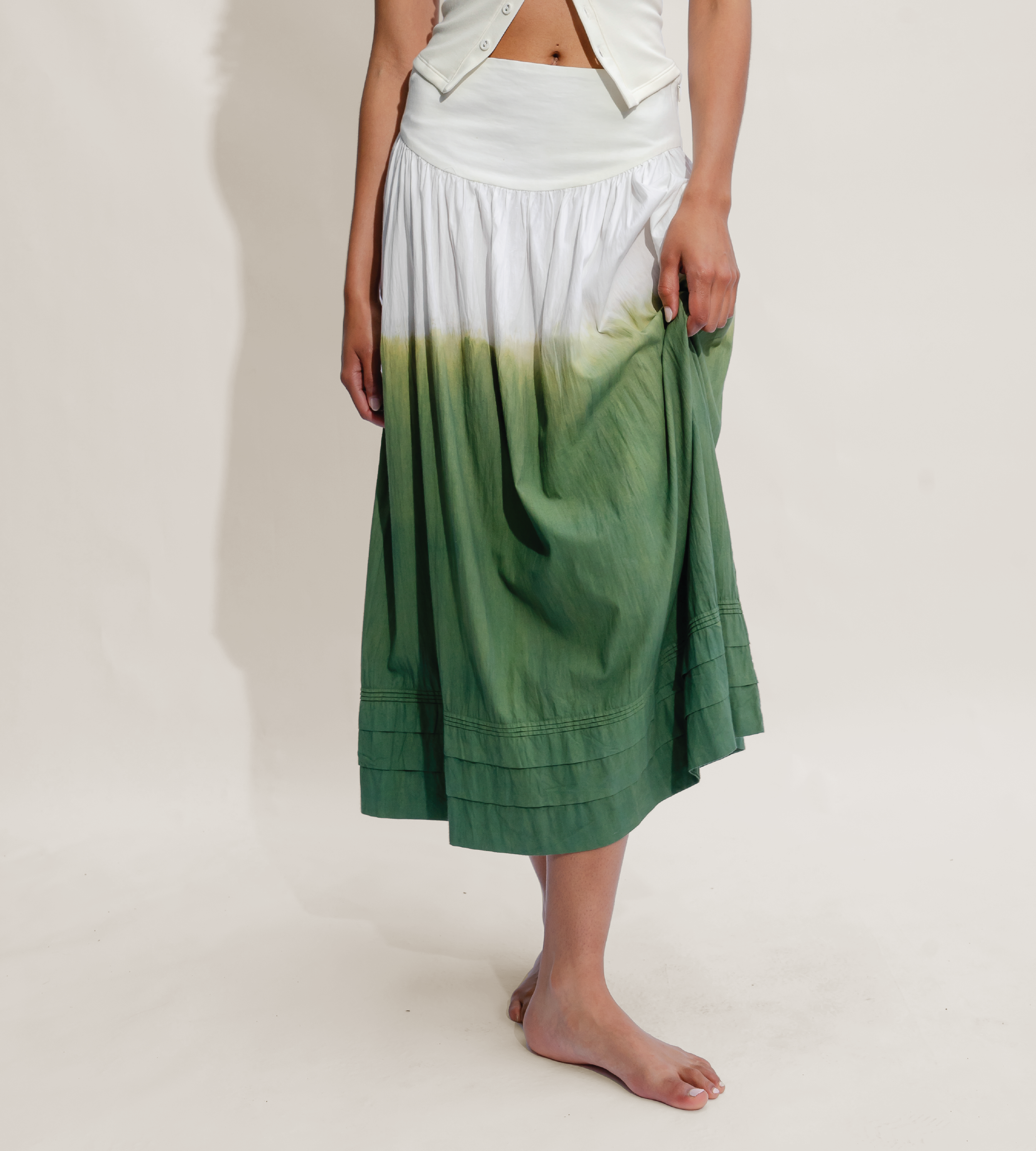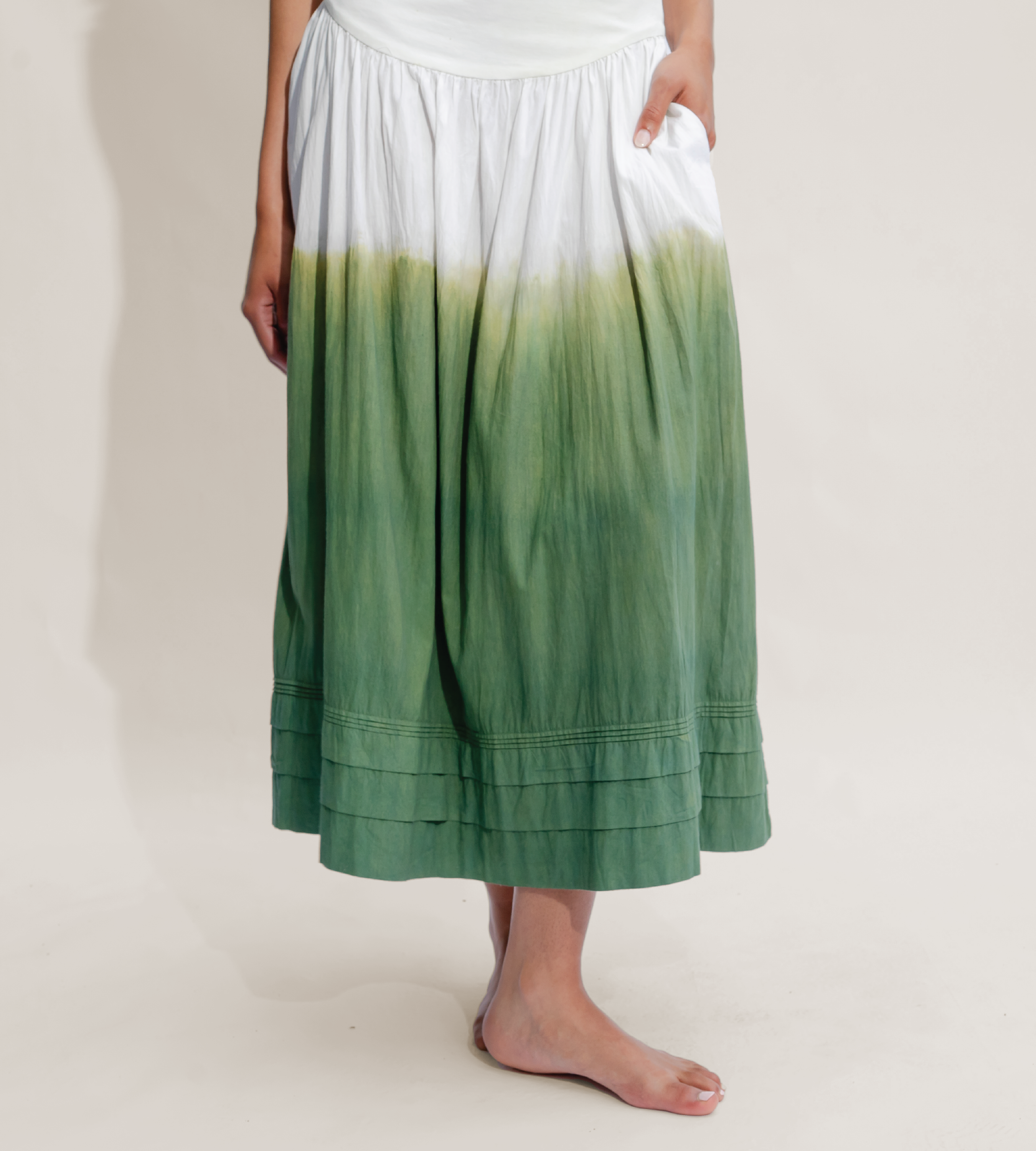 Unique by Nature — Dip-dyed with natural, organic dyes, the skirt features a softly faded gradient that evokes a gentle, dreamlike airiness in the shade "Sage". Each piece is hand-dyed by artisans, with no two ever exactly alike.