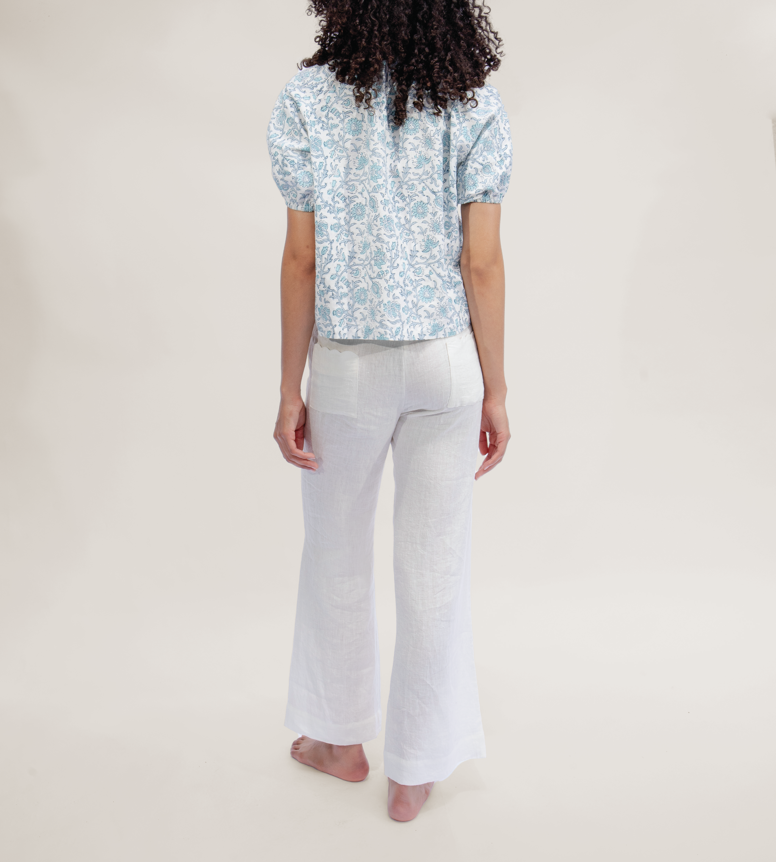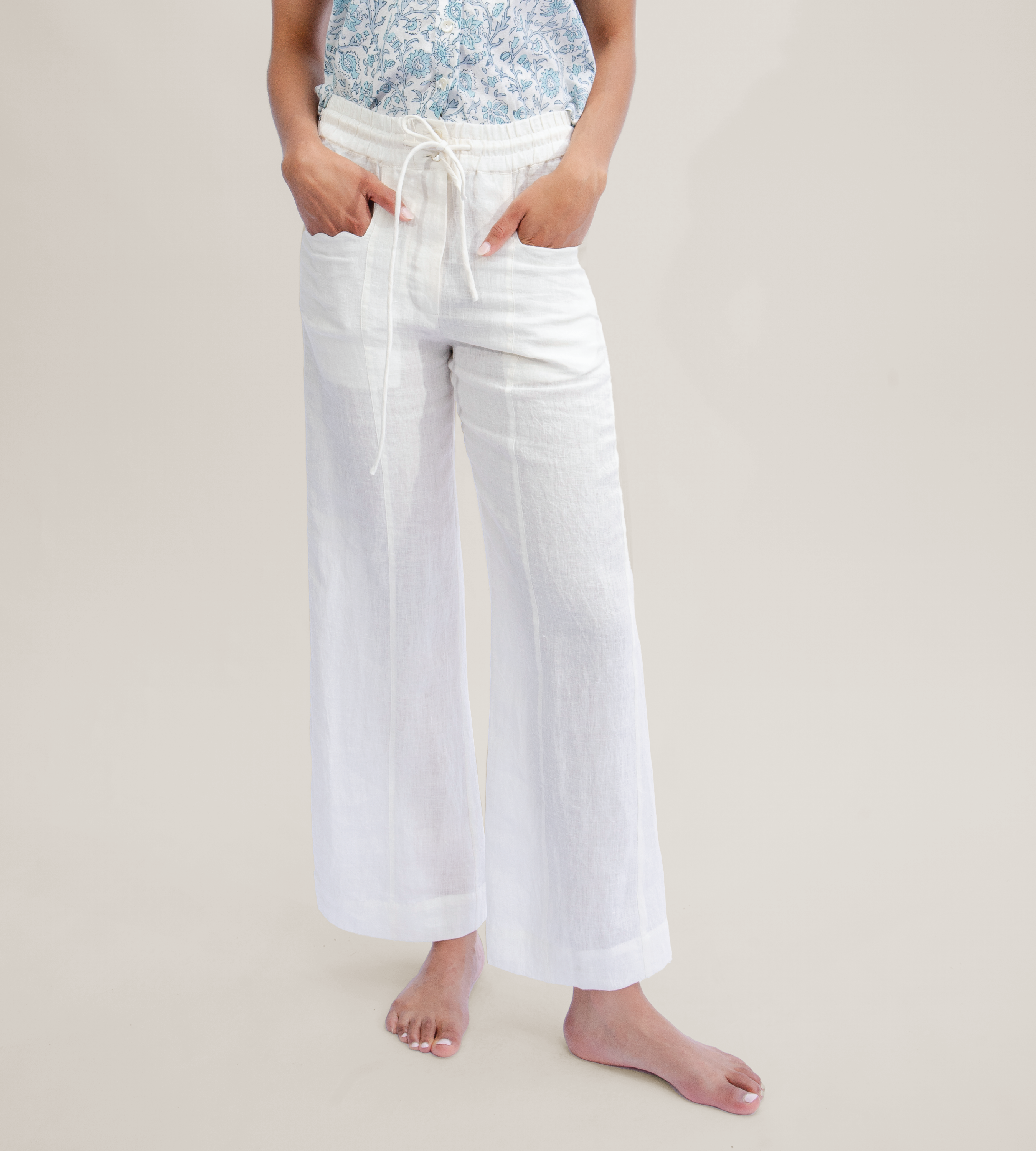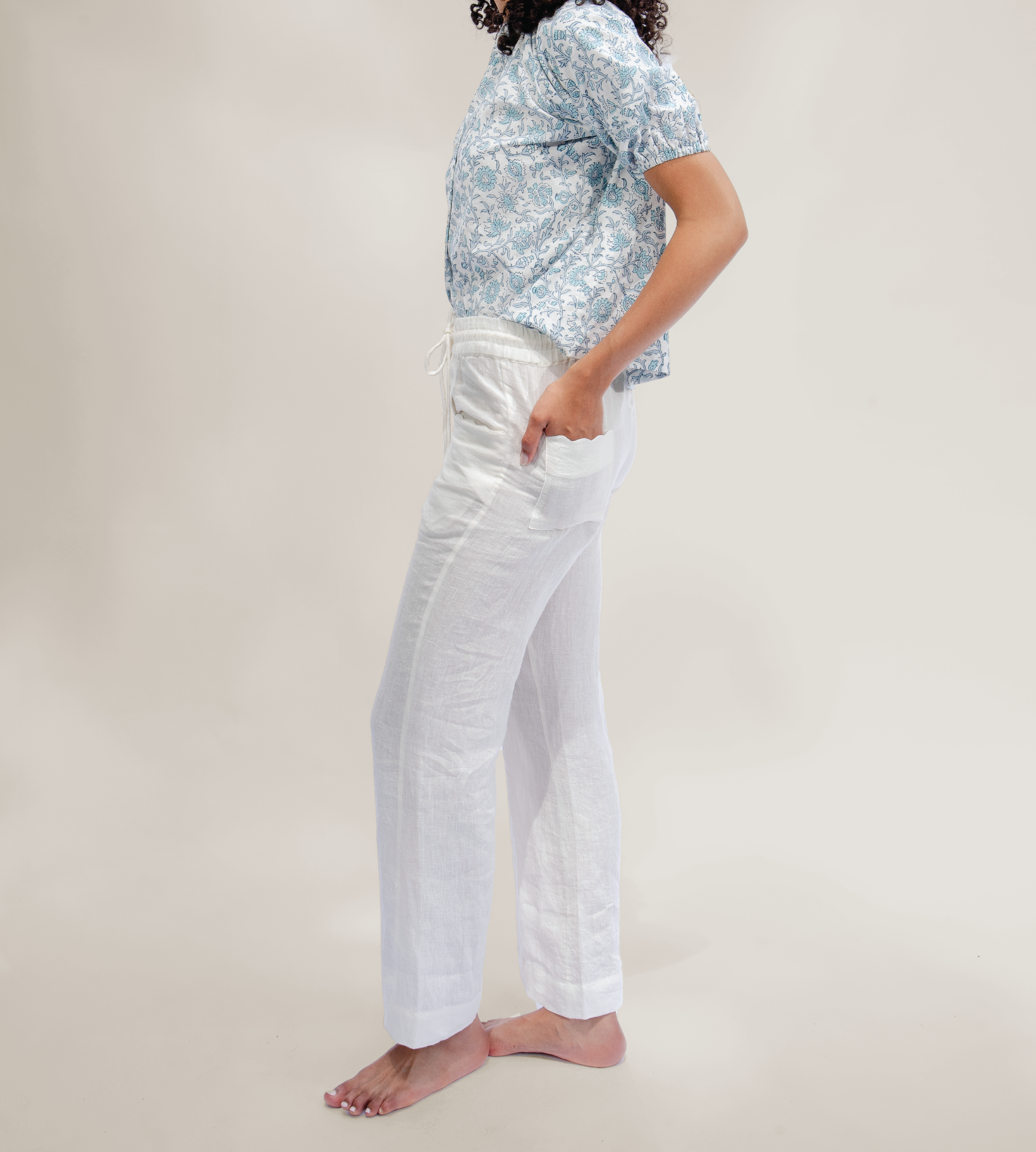 Easeful Practicality—Crafted from handwoven linen, the Synchronicity Pants drape effortlessly with soft proportions & artful fluidity. An elastic waistband & self-tying drawstring invite a sense of ease, while scalloped-edge pockets & luminous mother-of-pearl buttons offer a whisper of enchantment, reimagining a classic silhouette into a timeless expression of everyday dressing.