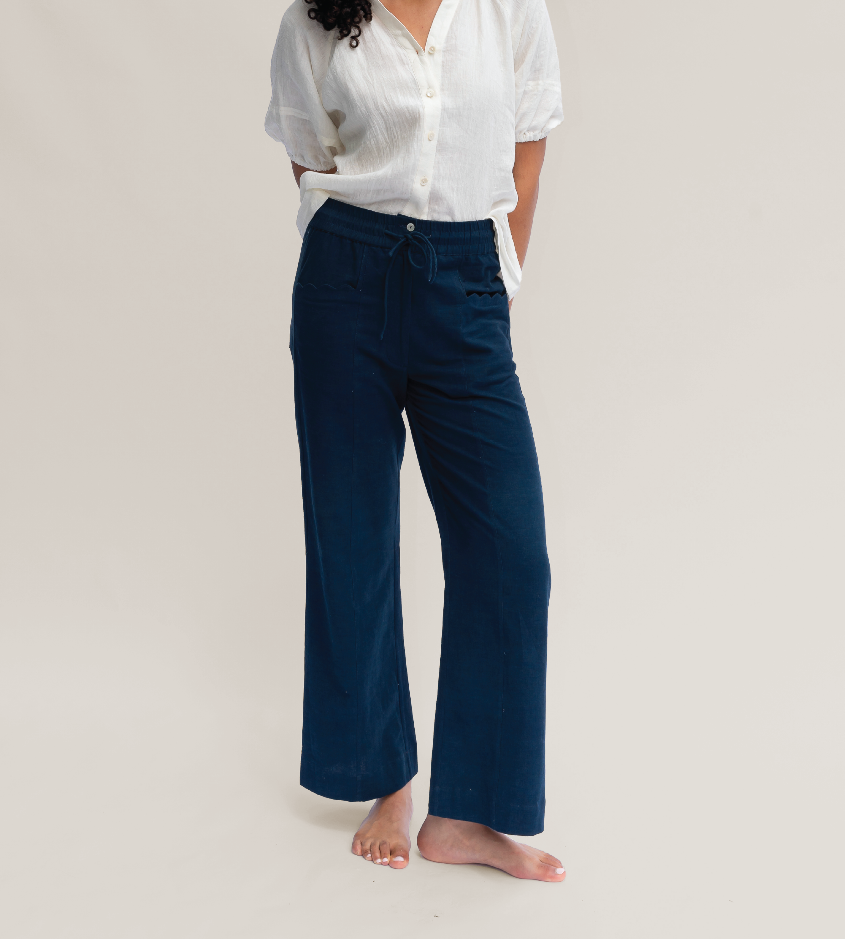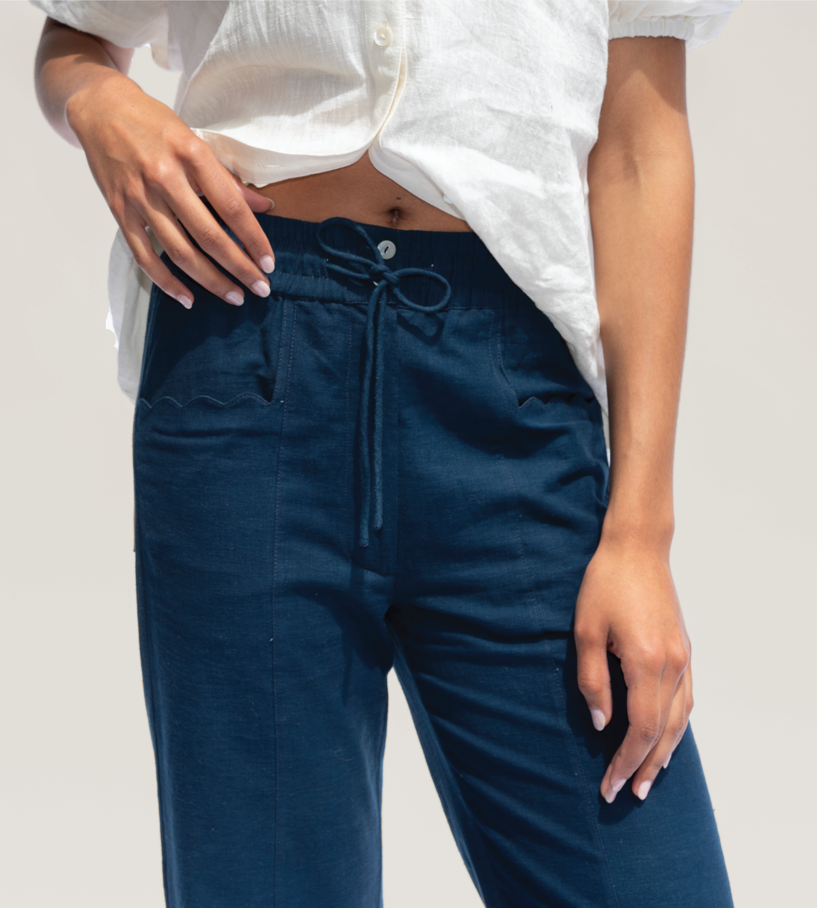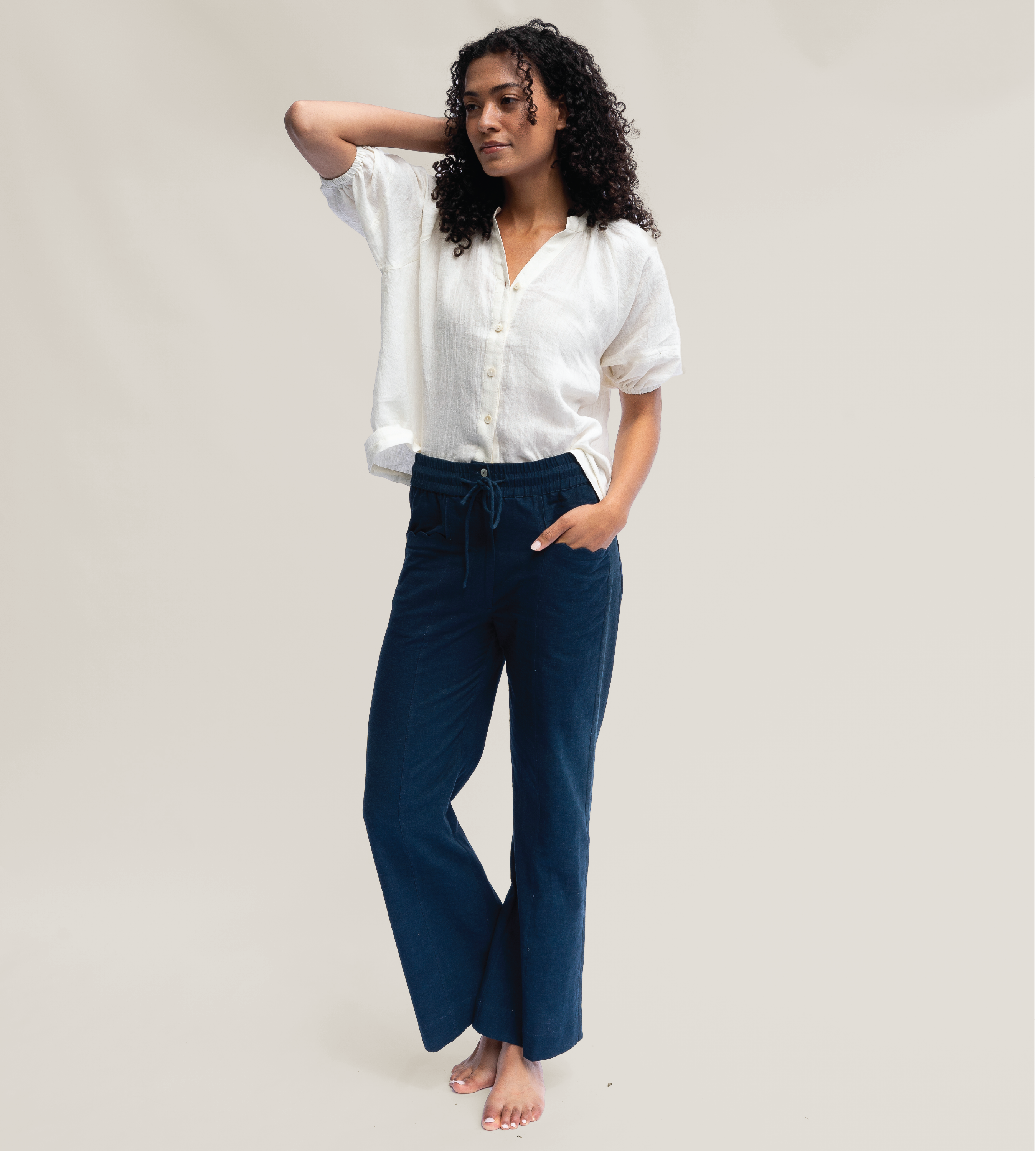 Easeful Practicality—Crafted from handwoven linen, the Synchronicity Pants drape effortlessly with soft proportions & artful fluidity. An elastic waistband & self-tying drawstring invite a sense of ease, while scalloped-edge pockets & luminous mother-of-pearl buttons offer a whisper of enchantment, reimagining a classic silhouette into a timeless expression of everyday dressing.