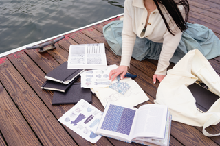The dock is quiet, but the moment is alive. Pages ruffle in the breeze, fabric shifts with the wind, and the water gently presses against the wood. Sunlight spills across the planks, casting a soft glow over notebooks, swatches, and fragments of past collections. Photographs, faded at the edges, sit beside sketches drawn with intention. Each piece is a whisper from seasons past, asking to be remembered. Here, inspiration lingers softly, an echo of what was, shaping what’s to come.
